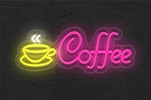 Brighten up your cafe, restaurant or kitchen with this pink and yellow coffee cup LED neon sign. The sign includes a free remote dimmer to adjust the brightness.
